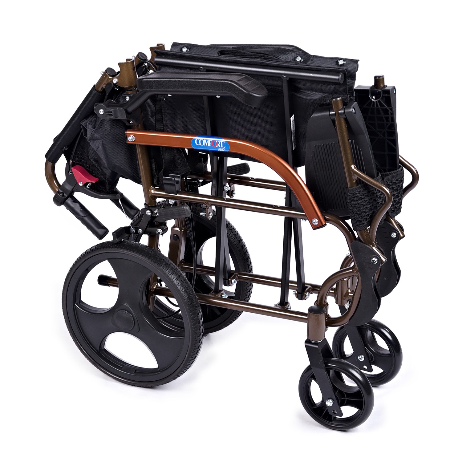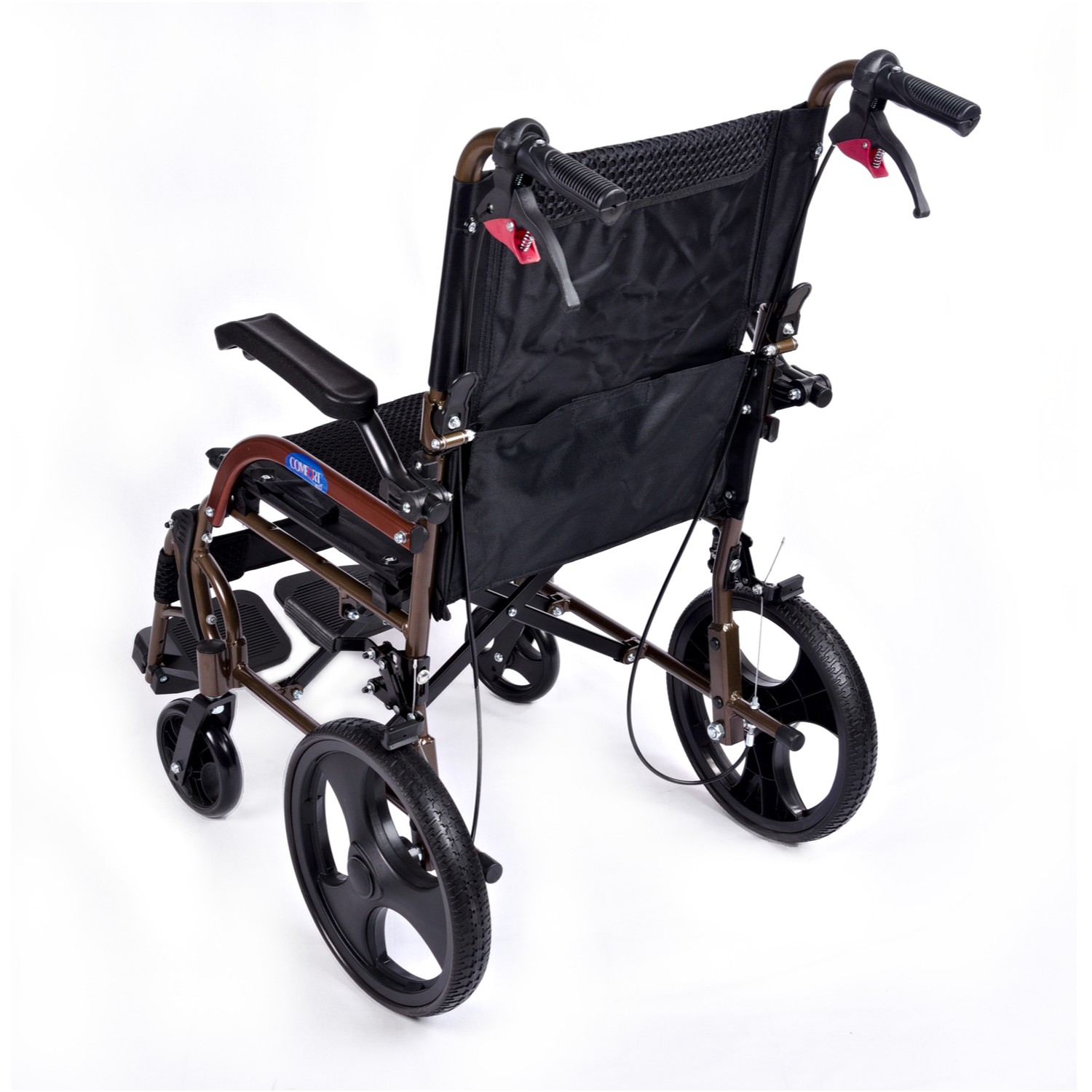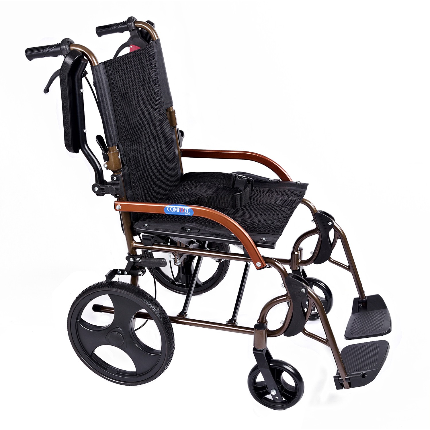 Comfort Plus GK863LABJ-12 Jet Black transfer alüminyum tekerlekli sandalye, hafif ve katlanabilir yapısı, refakatçi fren sistemi ve dayanıklı gövdesi ile hasta ve refakatçi kontrollü taşımayı konforlu ve pratik hâle getirir.