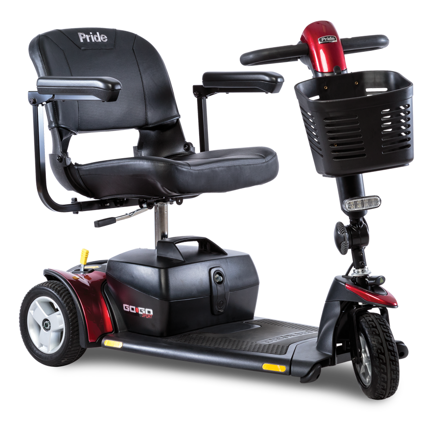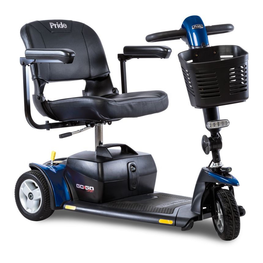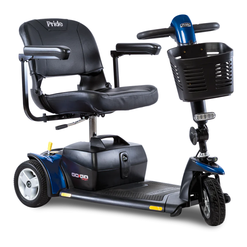 Pride Go Go® Sport 3 tekerlekli engelli scooter; kompakt, kolay manevra edilebilen ve güvenli sürüş özellikleriyle günlük hareket kabiliyetinizi artırır.