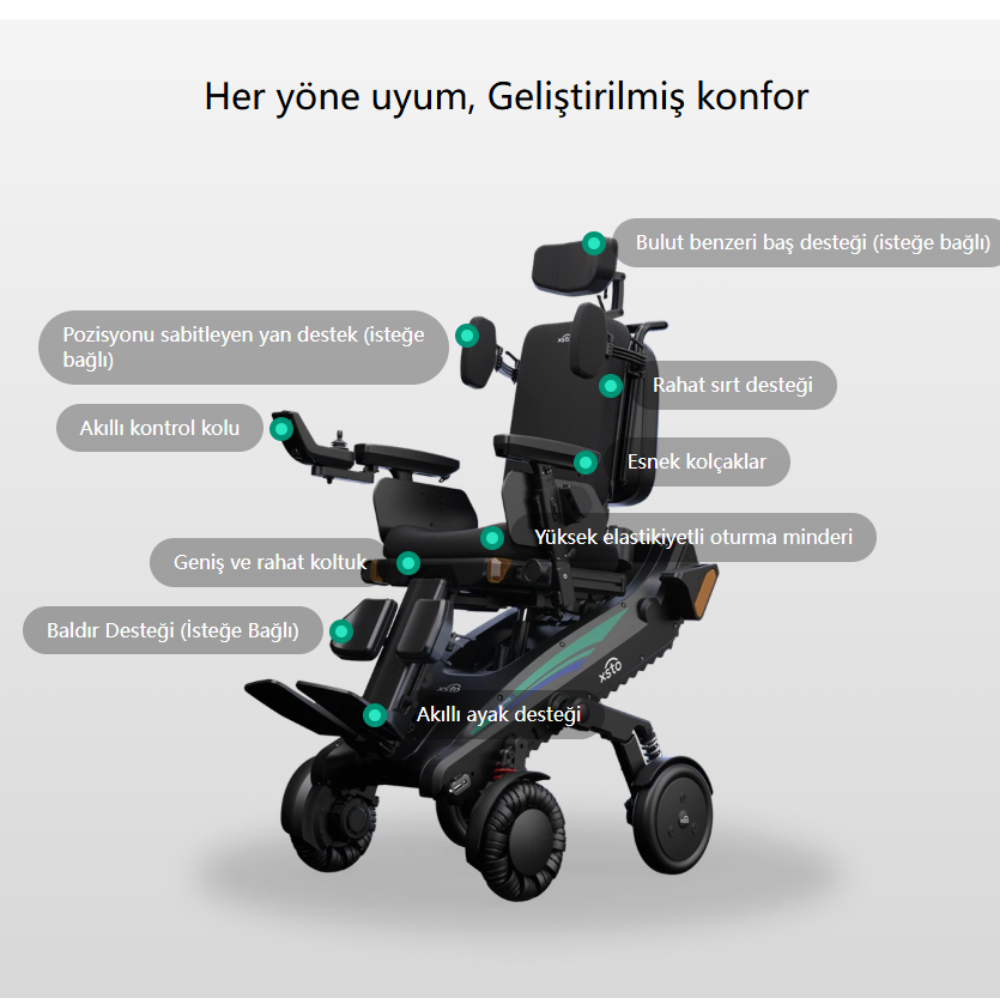 Gelişmiş AI denge sistemi ve sensör teknolojisi sayesinde merdiven çıkan akülü sandalye arayan kullanıcılar için benzersiz bir çözüm sunar. Xsto X12 Pro AL+, merdiven, rampa, çim, kum ve bozuk zeminlerde dahi stabil sürüş sağlar. Bu yönüyle en iyi akülü tekerlekli sandalye ve arazi tipi akülü sandalye önerileri arasında üst segmentte yer alır.